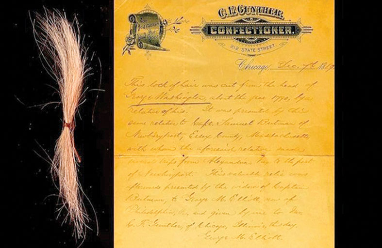 أول رئيس للولايات المتحدة كانت لديه خصلة من شعره الأبيض محفوظة منذ قرون، وهي الآن معروضة للبيع في مزاد بمبلغ 45 ألف دولار. كشف موقع Tmz أن خصلة شعر جورج واشنطن ملفوفة بشكل بيضاوي، وموضوعة في علبة زجاجية صغيرة تحيط بها حبّات اللؤلؤ من كل الجهات، ونقشت على الجزء الخلفي من العلبة الأحرف الأولى من اسمه «GW».