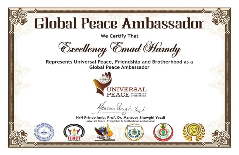 كما أعرب الفنان المصري العالمي عن بالغ شكره وامتنانه لرئيس المنظمة ، صاحب السمو الملكي الأمير «منصور يزدي» لتوصيته عماد حمدى رئيسا لمنظمة «السلام العالمي للصداقة والأخوة» بجمهورية مصر العربية.