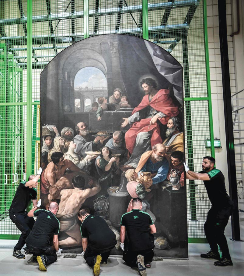 عمال يحملون لوحة كبيرة في موقع ترميم لوحات كاتدرائية نوتردام دي باريس  (ا ف ب)