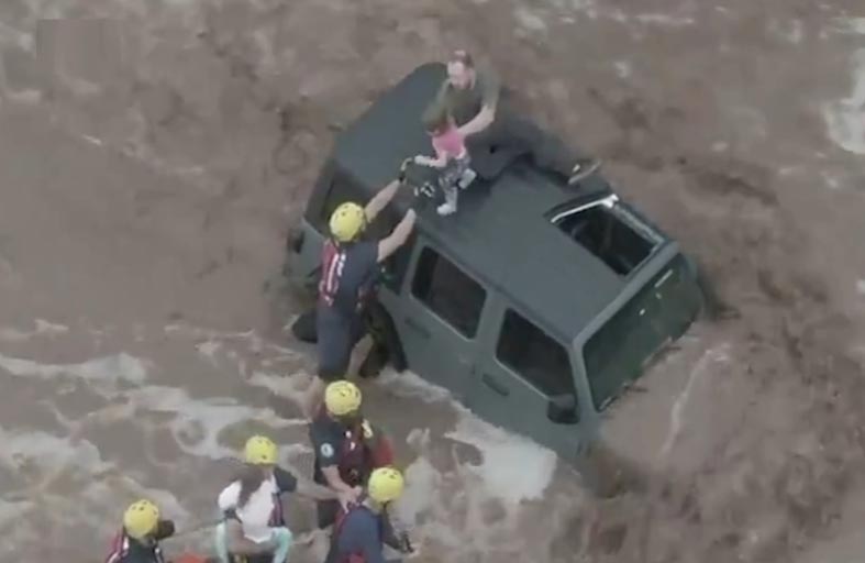 تمكّن رجال الإنقاذ في ولاية أريزونا الأميركية التي تضربها الفيضانات، من إجلاء رجل وابنتيه الصغيرتين، بعدما وجدوا أنفسهم عالقين على سقف مركبتهم وسط سيول جارفة. وأظهر فيديو سيارة عالقة وسط السيول الموحلة في كاتالينا بأريزونا، نتيجة غزارة المياه الجارفة وقوتها. وفي موقف بطولي، تحرك رجال الإنقاذ لسحب الفتاتين الصغيرتين من على سقف المركبة، وإيصالهما إلى بر الأمان، ومن ثم مساعدة الأب على النجاة أيضا.