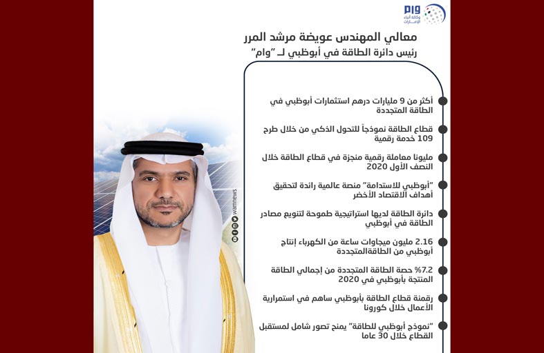 وحول مساهمة قطاع الطاقة النظيفة والمتجددة من إجمالي إنتاج الكهرباء في أبوظبي.. أوضح معالي عويضة المرر أنه في عام 2020 أنتجت أبوظبي 2.16 مليون ميجاوات ساعة من الكهرباء من مصادر الطاقة متجددة لتصل حصة الطاقة المتجددة من إجمالي الطاقة المنتجة للإمارة إلى حوالي 7.2? عام 2020 و يعود ذلك إلى تشغيل محطة نور أبوظبي للطاقة الشمسية الكهروضوئية التي تبلغ طاقتها 1177 ميجاوات أواخر عام 2019.
