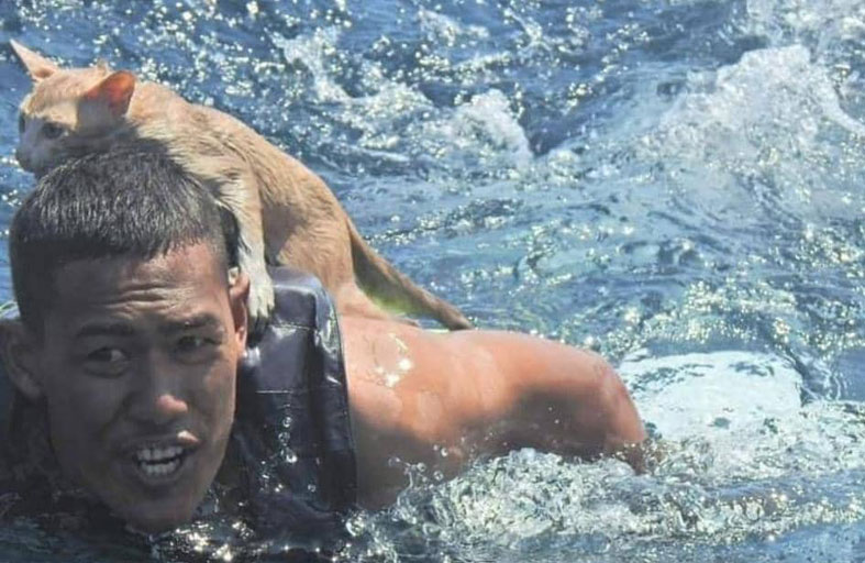 وبدا أن القصة أنت هنا، لكن عندما عارة البحارة التايلانديون إلى قرب السفينة المحترقة، التي بدأت في الغرق، علموا أن هناك قططا لا تزال موجودة على متن السفينة. وغطس بحار يبلغ من العمر (23 عاما) في مياه البحر وسبح باتجاه السفينة، وتمكن من الصعود عليها، ووضع ثلاثا من القطط في كيس أرز قديم وحمل واحدا على كتفه، وعاد إلى البحر، حيث سبح نحو سفينة البحرية. وقال البحار ثاتسافون ساي: عندما وصلنا، كانت مهمتنا تأمين الحطام والتأكد من تسرب الوقود". وتابع: "ننا لاحظنا وجود القطط على متن الطائرة، وفورا خلعت قميصي على الفور وارتديت سترة النجاة حتى أتمكن من القفز في البحر".