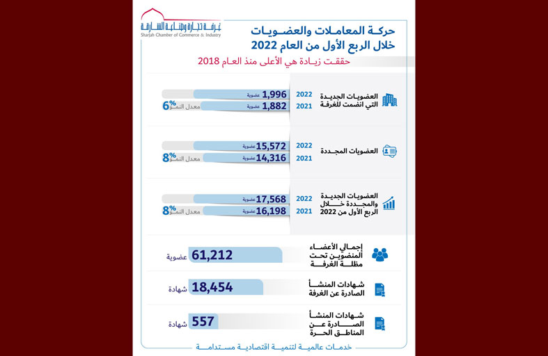 وبلغت نسبة الزيادة في عدد العضويات الجديدة المسجلة خلال الربع الأول من عام 2022، عن نفس الفترة خلال العام الماضي 6%، فيما بلغت نسبة الزيادة في عدد العضويات المجددة 8% عن العام 2021، كما وصل عدد شهادات المنشأ الصادرة إلى 18454 شهادة و 557 شهادة عن المناطق الحرة، لتعزز غرفة الشارقة من مكانتها كإحدى أهم غرف التجارة في منطقة الشرق الأوسط وشمال أفريقيا.