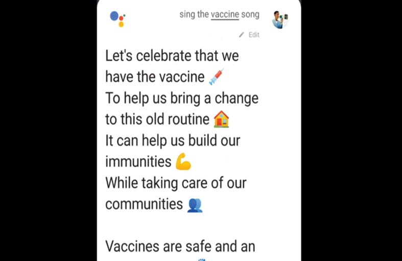 ويؤدي "أغنية اللقاح" مساعد "غوغل" الصوتي، ومن الممكن الاختيار في إعدادات الهاتف بين المؤدي بصوت رجل أو امرأة.