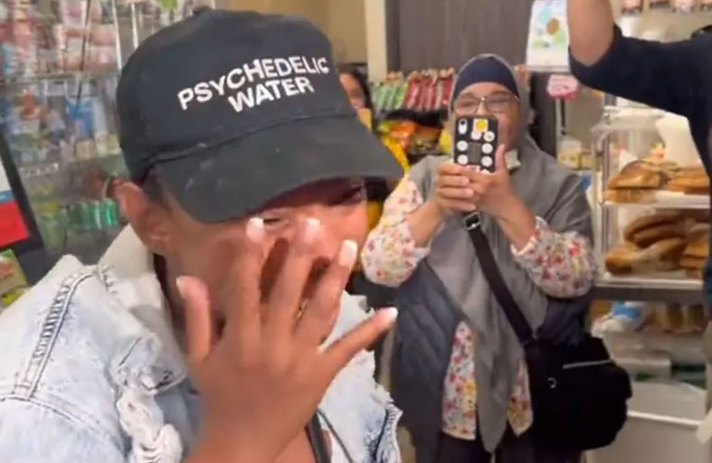 تمكنت من الإيماء عندما سئلت عما إذا كانت هي الفائزة، لكن عندما هرعت للخروج من المتجر، انهارت المرأة على ركبتيها واستمرت في البكاء وهي تلوح بيديها في الهواء.