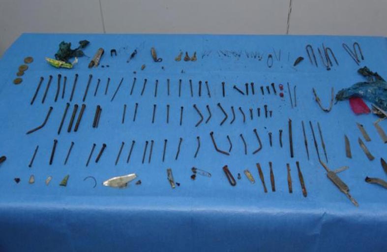 ومن الأجسام التي تم إخراجها في العملية التي استغرقت ساعتين ونصف الساعة: مقص أظافر وسكين جيب وسكين فاكهة وملاقط ومسامير وإبراً ومفاتيح.