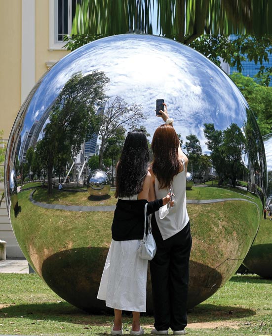 فتاتان تقفان لالتقاط صور أمام دائرة فنية عبارة عن كرة عاكسة من الفولاذ المقاوم للصدأ في حديقة عامة في سنغافورة  (ا ف ب)
