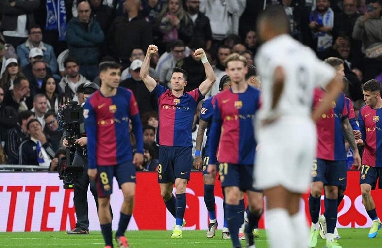 ألحق برشلونة الهزيمة الأولى بغريمه التقليدي ريال مدريد حامل اللقب في الدوري الإسباني لكرة القدم منذ 13 شهرا بعد أن أسقطه في عقر داره بصورة مذلّة 4-0 بفضل ثنائية البولندي روبرت ليفاندوفسكي في مواجهة الكلاسيكو ضمن المرحلة الـ 11 .