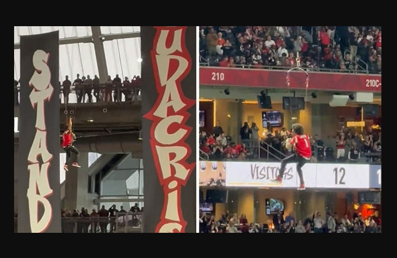 أظهر مقطع فيديو متداول لحظة هبوط لوداكريس "كريستوفر بريان بريدجز"  أول أول أمس الأحد من سماء ملعب "مرسيدس بنز"، خلال الاستراحة بين الربعين الثالث والرابع من مباراة كرة القدم الأمريكية لفريقي "الصقور" و"القديسين".