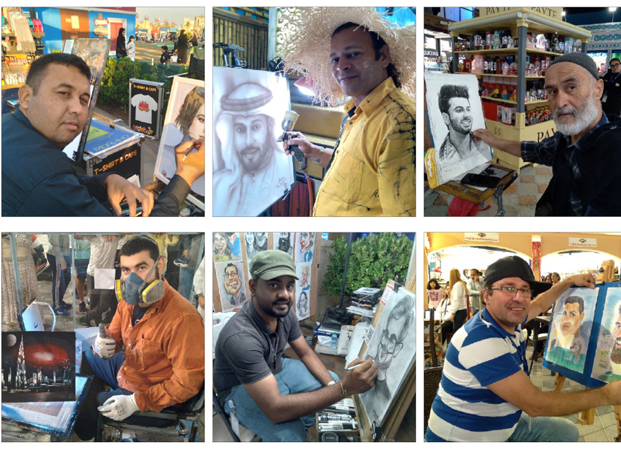 - ومحمد شمشاد علم.. فنان هندي يقيم في إمارة دبي ويشارك في القرية العالمية للمرة الثامنة على التوالي يرسم الضيوف سواء بورتريهات, أو بالكاريكاتور التي ينجز رسمها في ثلاث دقائق, بدأهذا الفن بعد إنهاء دراسته المدرسية في سن الثانية عشرة وكان له أصدقاء يمارسون فن الرسم وحاول تقليدهم وبدأ يرسم وبدأ يتحسن شيئا فشيئا, وصقل موهبته بالدراسة الجامعية في مجال فنون الرسم ونال بكالوريوس الفنون ثم الماجستير, وشارك معارض فنية كثيرة في الهند ونال الجائزة الوطنية من أحد المعارض التي شارك فيها.. والأن هو في القرية العالمية يمارس فنه مع ضيوف القرية بما يريدونه من لوحات فنية ولوحات زيتية أو رسمهم كاريكاتوريا أو بروتريه.