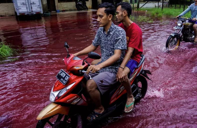 غمرت مياه قرمزية قرية إندونيسية بعدما أتت الفيضانات على مركز لصبغ الأقمشة في وسط جاوة ما أثار تعليقات واسعة النطاق على وسائل التواصل الاجتماعي.وشوهد سكان جينغوت قرب بلدة بيكالونغان وهم يمرون عبر مياه حمراء اللون يوم السبت، ونشر كثر صورا لهذه الظاهرة النادرة على الإنترنت.وأكد مسؤولون في وقت لاحق أن اللون الفريد جاء من صبغة قماش غير ضارة تستخدمها العديد من مصانع التطبيع الباتيكي في المنطقة.