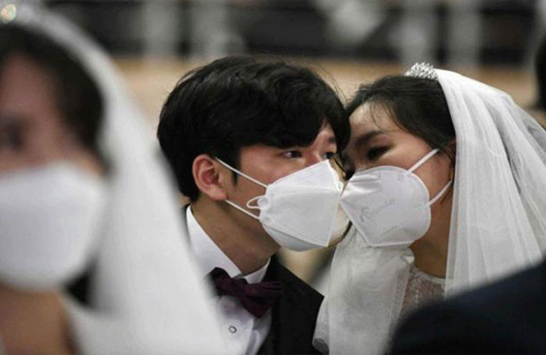 قبلات من وراء الكمامات في حفل زفاف جماعي