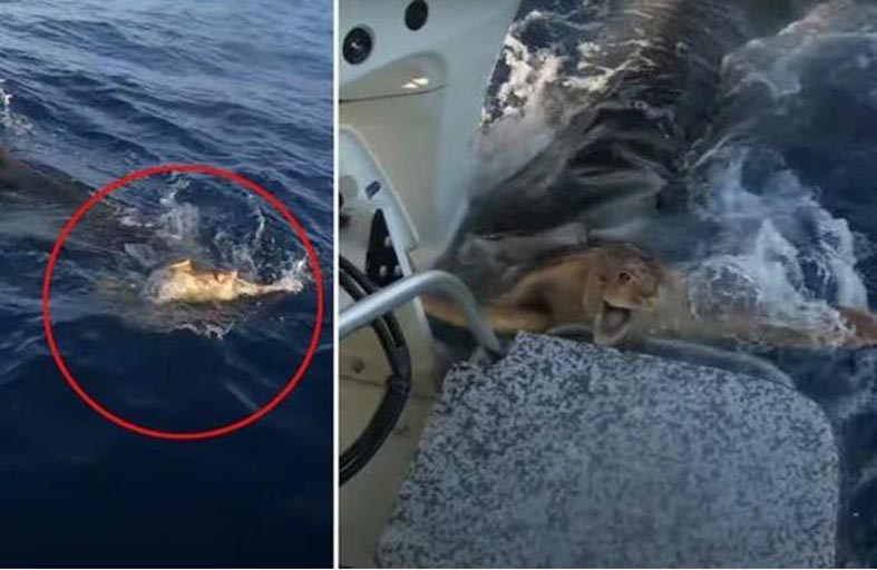 وفي حالة من الاستغراب انتبه شبان على متن قارب في رحلة بحرية إلى القرش يدفع بالسلحفاة البحرية نحوهم بإصرار.