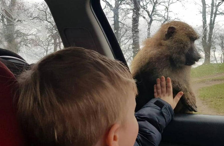 وعادة ما تمزق قردة البابون في حديقة "نوزلي" بمقاطعة ميرسيسايد شمال غربي إنجلترا، المساحات الأمامية لسيارات الزوار، كما تكسر المرايا الجانبية.