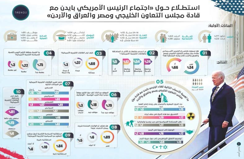 أظهر استطلاع جديد للرأي أجراه مركز تريندز للبحوث والاستشارات أن منطقة الخليج مهمة جداً بالنسبة للسياسة الخارجية الأمريكية، وأن العلاقات الخليجية الأمريكية تسير بشكل ممتاز، وأن زيارة الرئيس جو بايدن للمنطقة واجتماعه مع قادة دول مجلس التعاون لدول الخليج العربية ومصر والعراق والأردن سيعزز مستقبل هذه العلاقات.