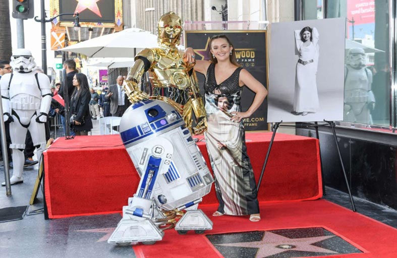وكُرّمت فيشر التي توفيت عام 2016 جرّاء أزمة قلبية من ابنتها بيلي لورد. وأقيم الاحتفال على الرصيف الهوليوودي الشهير بمناسبة الرابع من أيار-مايو الذي بات يُعدّ "يوم حرب النجوم" ويحتفل به في الولايات المتحدة محبو السلسلة التي أطلقها جورج لوكاس.