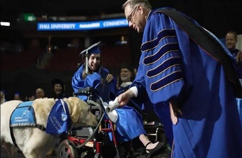 سرق كلب يُدعى جاستن الأضواء في حفل التخرج بجامعة سيتون هول في نيوجيرسي بحصوله على دبلومة على خشبة المسرح.وأشاد المشاهدون بالفيديو الذي التقط لحظة تسليم الكلب للشهادة، والذي شاركته الجامعة في الأصل على وسائل التواصل الاجتماعي ويظهر جاستن وهو يتلقى شهادته. وفي الفيديو، يقدم جوزيف إي ناير من جامعة سيتون هول، جريس مارياني وكلبها المساعد جاستن، مع شهاداتهما. وهتف الجمهور بصوت عالٍ عندما قبل جاستن الوثيقة الملفوفة، احتفالاً بتفانيه ليس فقط في مساعدة مارياني ولكن أيضاً بحضور جميع فصولها الدراسية خلال فترة وجودها في الجامعة. وتخرجت مارياني بدرجة بكالوريوس العلوم في التربية. وقالت الجامعة لشبكة سي بي إس نيوز إن هدفها هو التدريس في التعليم الابتدائي والخاص. وكان جاستن إلى جانبها منذ أن استقبلته من خلال منظمة Canine Companion. ومع وجود جاستن إلى جانبها، تعتزم مارياني التدريس في مدارس الاحتياجات الخاصة والمدارس الابتدائية، بحسب موقع إن دي تي في.