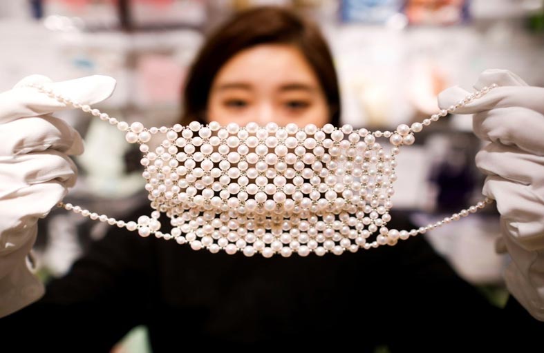 يمكن الآن لأيقونات الموضة في اليابان حماية النفس من فيروس كورونا بنوع من البذخ والترف.. كمامات مرصعة بالألماس واللآلئ يبلغ ثمن الواحدة منها مليون ين (9600 دولار).