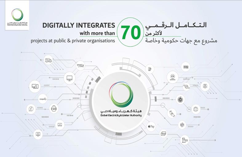 استكملت هيئة كهرباء ومياه دبي التكامل الرقمي لأكثر من 70 مشروعاً مع جهات حكومية وخاصة تضمنت تسهيل مجموعة كبيرة من الخدمات منها خدمة سداد الفواتير وتحديث المعلومات وخدمة تشغيل الكهرباء والمياه وتعديل رسوم السكن واسترداد المبالغ المستحقة وتحديث الرخصة التجارية وغيرها.