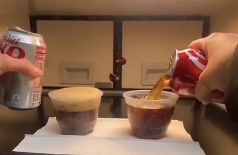 قالت مضيفة طيران في فيديو على تيك توك، إن صب الدايت كولا، يستغرق وقتاً أطول من المشروبات الغازية الأخرى، في الجو.وفي المقطع الذي حصد أكثر من 300 ألف مشاهدة، صورت آرييل سينسنيروس، نفسها تصب مشروباً دايت كولا، وكولا، واستغرقت رغوة الفوار عند صب الدايت كولا وقتاً أطول لتستقر.