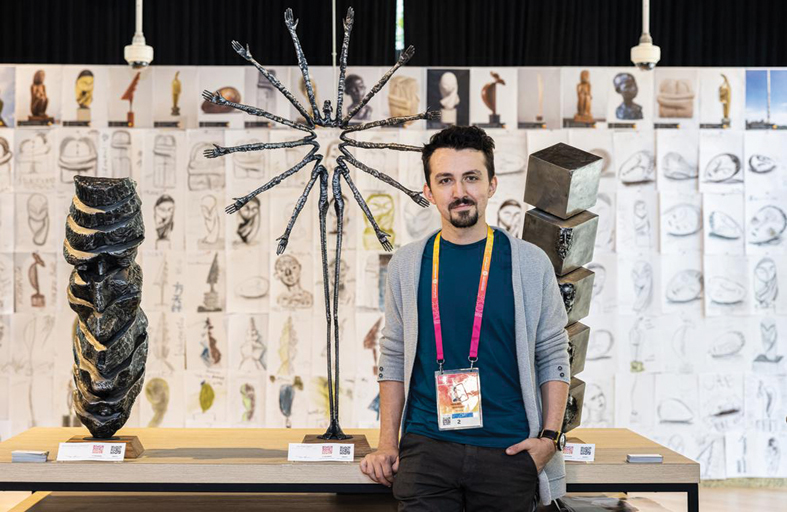 يهدف رادوليسكو من خلال ورشته الفنية، التي تحمل نفس الاسم الذي تحمله إحدى المنحوتات الثلاث التي يعرضها فيها، إلى تعريف زوار الجناح الروماني على أعماله وإبداعاته الفنية، التي ينجزها باستخدام مواد مختلفة؛ كالفولاذ والفحم ومعدن الجرافيت، إضافة إلى دعوتهم للمشاركة في رسم لوحاتهم الخاصة باستخدام هذه المواد، التي تنسجم مع مفهوم الاستدامة القائم على الاستخدام المسؤول للموارد، والإبداع بصبر وعناية لتحقيق التوازن بين الإنسان والطبيعة. وشارك بعض الزوار، يوم أمس الأول السبت، في رسم لوحات باستخدام المواد المختلفة التي يقدمها النحات رادوليسكو، خاصة الفحم والجرافيت، مستلهمين أعمال قسطنطين برانكوسي، النحات الروماني الحداثي الشهير، كما التقطوا صورا تذكارية مع دانيال رادوليسكو، أمام جدارية كبيرة علقت عليها اللوحات الفنية التي قاموا برسمها خلال ورشة العمل.