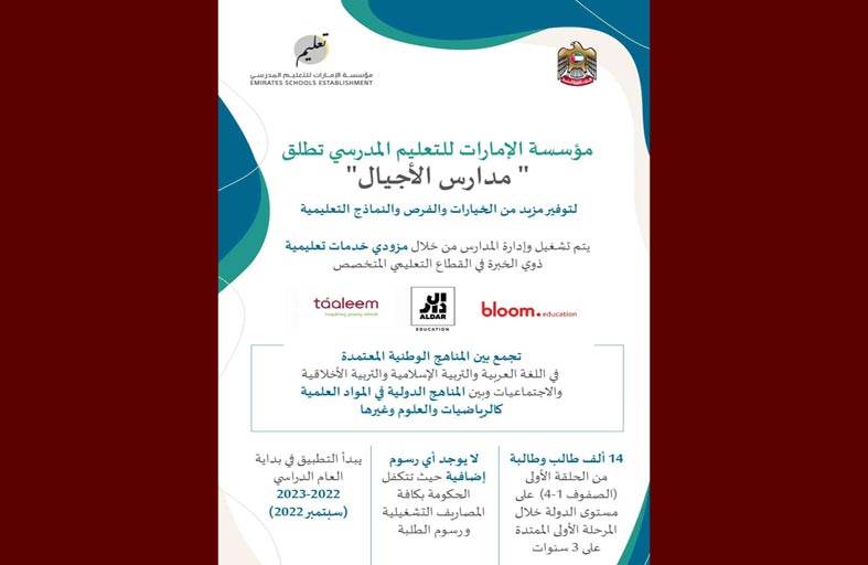 مؤسسة الإمارات للتعليم المدرسي تعلن إطلاق مدارس الأجيال بدءاً من العام الدراسي القادم 2022-2023