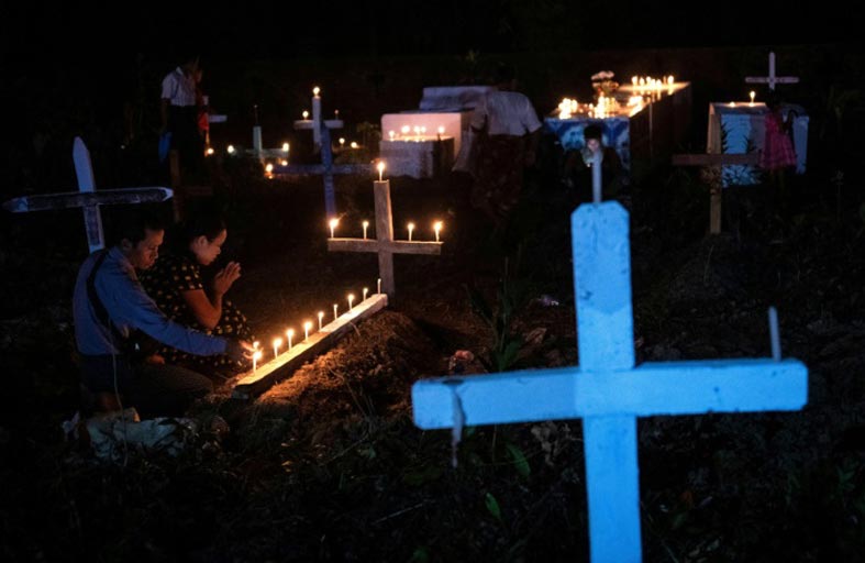 شارك مئات الكاثوليك في مسيرة السبت بين مقابر بيضاء مضاءة بالشموع، احتفالا بعيد جميع القديسين في بورما، وهو تجمّع ديني نادر منذ تولي الجيش السلطة في البلاد.