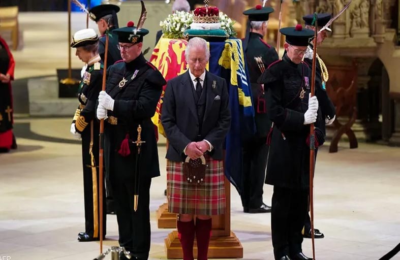 ارتدى ملك بريطانيا تشارلز الثالث تنورة قصيرة وجوارب حمراء خلال زيارته كاتدرائية "سانت غايلز" في العاصمة الاسكتلندية إدنبرة، لإلقاء نظرة على نعش الملكة الراحلة إليزابيث الثانية.
