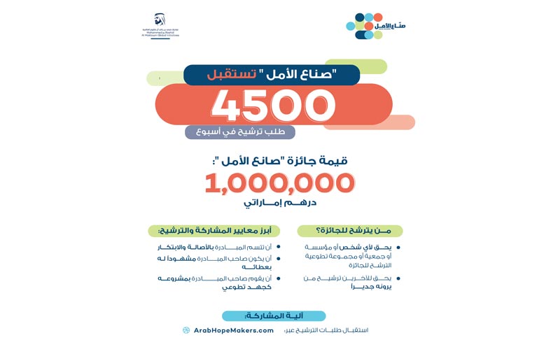 استقبلت مبادرة "صناع الأمل"، 4500 ترشيح بعد مرور أسبوع واحد على إعلان صاحب السمو الشيخ محمد بن راشد آل مكتوم نائب رئيس الدولة رئيس مجلس الوزراء حاكم دبي "رعاه الله"، البحث عن صناع الأمل لعام 2023، مع انطلاق الدورة الرابعة من المبادرة، الأكبر من نوعها عربياً لتكريم أصحاب العطاء. وتواصل الدورة الرابعة من مبادرة "صناع الأمل" تلقي طلبات المشاركة والترشيح عبر الموقع الإلكتروني arabhopemakers.com.ويحق لأي شخص صاحب مبادرة إنسانية أو مجتمعية في أي مجال أو نشاط، التقدم لجائزة صناع الأمل، كما يحق لأي مؤسسة أو جمعية أو مجموعة تطوعية أو مؤسسة ذات نشاط إنساني أو مجتمعي الترشح للجائزة، و يحق للآخرين ترشيح من يرونه جديراً بذلك، وتمنح المبادرة صانع الأمل الرابح مكافأة مالية بقيمة مليون درهم إماراتي.