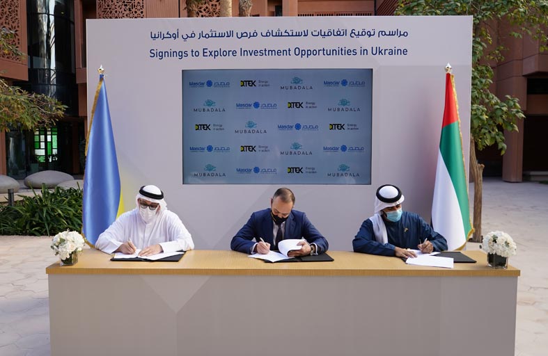 ولا شك أن توقيع مذكرات تفاهم مع عدد من أبرز الهيئات والمؤسسات في أوكرانيا يؤكد حرصنا على استكشاف فرص الاستثمار ومجالات التعاون المختلفة خاصة أن أوكرانيا تمتلك إمكانات واعدة للاستثمارات الأجنبية». ومن جانبه قال معالي رومان ليشينكو: “من دواعي شرفنا أن نتعاون مع شركاء يؤمنون بالقيم نفسها ويتفقون معنا حول عدد من الأولويات وأهمها السلامة الغذائية وتطوير العلاقات التجارية والدخول في مشاريع استثمارية جديدة”. كما تم توقيع مذكرة تفاهم ثلاثية بين شركة مبادلة للاستثمار وشركة أبوظبي لطاقة المستقبل “مصدر” و”دي تي إي كي” الأوكرانية، بهدف استكشاف إمكانات الاستثمار في قطاع الطاقة النظيفة في أوكرانيا، حيث وقّع عن “مصدر” رئيسها التنفيذي محمد جميل الرمحي، فيما وقّع ماكسيم تيمشينكو عن “دي تي إي كي».