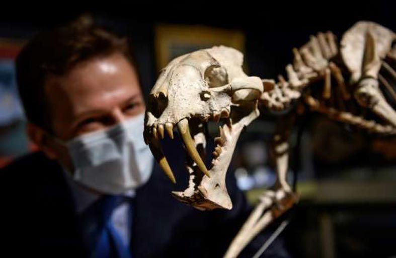 سيكون هيكل عظمي مميز لـ نمر سيفي تم اكتشافه أخيراً في أرض مزرعة أميركية، من بين نحو 40 قطعة من التاريخ الطبيعي تباع ضمن مزاد علني الثلاثاء في جنيف.