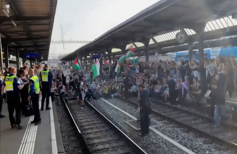 قطع مئات المتظاهرين المؤيدين للقضية الفلسطينية في سويسرا مسارات قطارات في محطتي جنيف ولوزان، ممّا تسبّب بتعطيل الحركة لبعض الوقت.