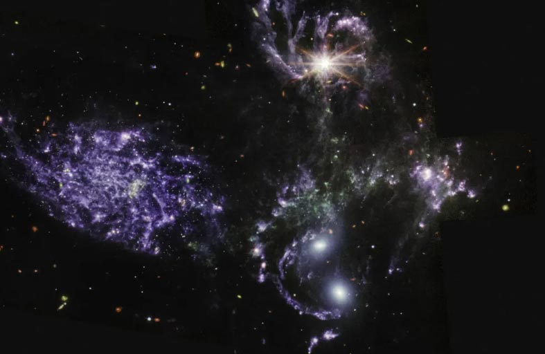 رصد تلسكوب "جيمس ويب"، التابع لوكالة الفضاء والطيران الأميركية "ناسا"، 5 مجرات قريبة من بعضها ومتحركة، تبدو وكأنها ترقص في الفضاء. وكشفت الوكالة الأميركية أمس الأول الثلاثاء مجموعة من الصور الحديثة من التقاط التلسكوبجيمس ويب، وذلك بعد يوم من كشفها أعمق صورة ملونة بالكامل للكون. من بين هذه الصور، واحدة تظهر تفاصيل لم يسبق لها مثيل عن مجموعة المجرات "Stephan’s Quintet" (خماسية ستيفان).