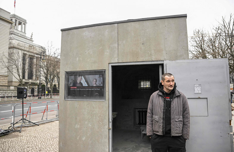 وضع مؤيدون للمعارض الروسي المسجون أليكسي نافالني مجسما يمثل الزنزانة التي يقبع داخلها قبالة مقر السفارة الروسية في برلين.ومنذ عامين يقضي نافالني المعارض الأبرز للرئيس الروسي فلاديمير بوتين عقوبة بالسجن في معسكر اعتقال شديد الحراسة خارج موسكو.