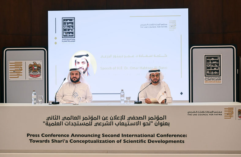 عقد مجلس الإمارات للإفتاء الشرعي امس، مؤتمرًا صحفيًا للإعلان عن تفاصيل إطلاق “المؤتمر العالمي الثاني للمجلس”، والذي سيعقد يومي 7 و 8 نوفمبر المقبل في أبوظبي، تحت رعاية كريمة من سمو الشيخ عبدالله بن زايد آل نهيان وزير الخارجية، وبرئاسة معالي العلامة الشيخ عبدالله بن بيه رئيس المجلس؛ وذلك تحت عنوان “نحو الاستيعاب الشرعي للمستجدات العلمية - المنهجية الحضارية، والتطبيقات الواقعية، وأخلاقيات الاستدامة».