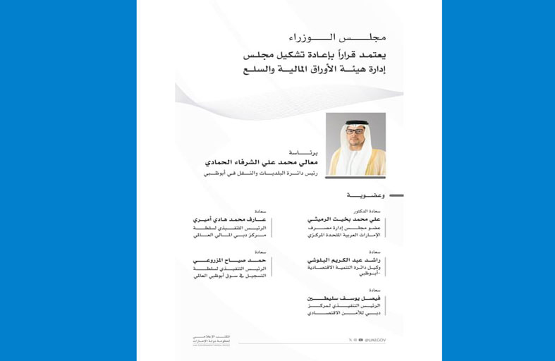 اعتمد مجلس الوزراء قراراً بالموافقة على إعادة تشكيل مجلس إدارة هيئة الأوراق المالية والسلع لمدة ثلاث سنوات، برئاسة معالي محمد علي الشرفاء الحمادي، رئيس دائرة البلديات والنقل في أبوظبي، وعضوية كل من سعادة الدكتور علي محمد بخيت الرميثي، عضو مجلس إدارة مصرف الإمارات العربية المتحدة المركزي، وسعادة راشد عبد الكريم البلوشي، وكيل دائرة التنمية الاقتصادية في أبوظبي، وسعادة فيصل يوسف سليطين، الرئيس التنفيذي لمركز دبي للأمن الاقتصادي، وسعادة عـارف محمد هادي أميري، الرئيس التنفيذي لسلطة مركز دبي المالي العالمي، وسعادة حمد صياح المزروعي، الرئيس التنفيذي لسلطة التسجيل في سوق أبوظبي العالمي، وممثل عن فئة الشباب يتم ترشيحه من قبل الأمانة العامة لمجلس الوزراء. ويتولى مجلس إدارة هيئة الأوراق المالية والسلع مسؤولية اعتماد السياسة العامة وإقرار اللوائح والقواعد العامة للهيئة، ووضع الخطط والبرامج اللازمة لتنفيذها بعد اعتمادها، وإقرار الأنظمة والبرامج الهادفة إلى تنظيم وتطوير أسواق المال والسلع في الدولة بما يتماشى مع أفضل الممارسات الدولية، وتطوير التشريعات والأنظمة التي تحكم عمل الأسواق، ودعم الابتكار في الخدمات المالية، وتعزيز الوعي الاستثماري لدى الجمهور، وتعزيز التعاون مع الجهات المحلية والدولية لتبادل الخبرات ومواكبة التطورات العالمية في قطاع الأوراق المالية والسلع. كما يتولى مجلس إدارة الهيئة، بالتنسيق مع السلطات المعنية، مسؤولية التأكد من تطبيق الأنظمة الخاصة بنظام الإدراج ونظام الوسطاء ونظام التداول ونظام الإفصاح في أسواق المال بالدولة، والتأكد من اتخاذ التدابير اللازمة لوقف التعامل مؤقتاً في أسهم أية شركة أو في أية أوراق مالية في حال حدوث ظروف استثنائية تهدد حسن سير العمل في السوق، وتجميد أو تعليق أو إعادة العمل بأية لائحة أو نظام يتعلّق بالسوق، وغيرها من الإجراءات، بما يضمن تحقيق الشفافية وحماية حقوق المستثمرين وتعزيز الثقة في الأسواق المالية بالدولة.