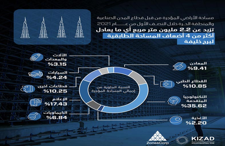 أعلنت مجموعة موانئ أبوظبي عن تأجير أكثر من 2.2 مليون متر مربع من الأراضي الصناعية التابعة لقطاع المدن الصناعية والمنطقة الحرة، لشركات محلية وإقليمية ودولية خلال النصف الأول من عام 2021، ما يسلط الضوء على تنامي الطلب على الأراضي الصناعية منذ مطلع العام الجاري على الرغم من تبعات جائحة (كوفيد-19) على الشركات، حيث تركز الطلب في عدد من القطاعات على رأسها المعادن والأغذية والسيارات والتكنولوجيا والكيماويات.