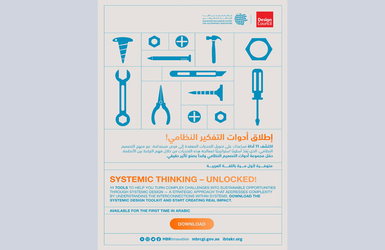 طوّر مركز محمد بن راشد للابتكار الحكومي بالتعاون مع مجلس التصميم في المملكة المتحدة، النسخة العربية من "حزمة أدوات التصميم النظامي"، التي أطلقها المجلس حديثاً، وتضُم إحدى عشرة أداة ابتكارية تُنظم عملية تصميم التفكير والحلول الابتكارية، وتسهم في تمكين الأفراد والحكومات من إيجاد حلول أكثر شمولا واستدامة للتحديات العالمية.