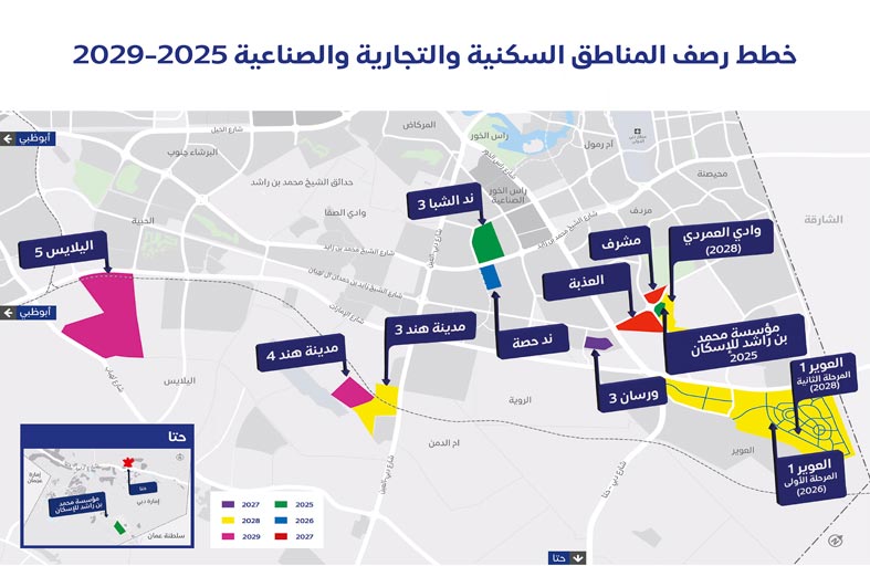 كما ستنفذ طرقاً داخلية في منطقة حتا، لخدمة مشروع مؤسسة محمد بن راشد للإسكان الذي يضم 100 مسكن، وستنفذ الهيئة في 2026، طرقاً داخلية بطول 92 كيلومتراً في منطقتي ند حصة، والعوير الأولى، وسيجرى عام 2027 تنفيذ طرق بطول 45 كيلومتراً في مناطق العذبة ومشرف وحتا، كما سيجري تنفيذ طرق داخلية في منطقة الورسان الثالثة (صناعية) بطول 14 كيلومتراً.
