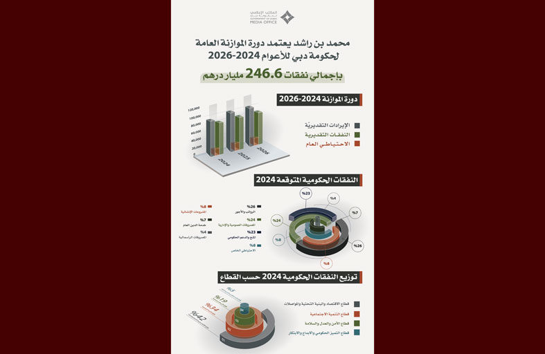 وتقدر النفقات للسنة المالية 2024 بإجمالي يبلغ 79.1 مليار درهم، في تعبير واضح عن إصرار الإمارة على دعم المشاريع التنموية وتحفيز الاقتصاد الكلي وتحقيق الأهداف الطموحة لخطة دبي 2030 وأجندة دبي الاقتصادية D33؛ وتواصل دبي في موازنة العام المالي 2024 الاهتمام بالخدمات الاجتماعية وتطوير قطاع الصحة وقطاع التعليم والثقافة والبنية التحتية؛ وجاءت دورة الموازنة 2024 - 2026 لتعبر عن رؤية دبي للمستقبل من خلال دعم بحوث الفضاء والرقمنة والذكاء الاصطناعي كما ركزت على الاهتمام بريادة الأعمال وخلق بيئة محفزة للقطاعات المختلفة بالإمارة.