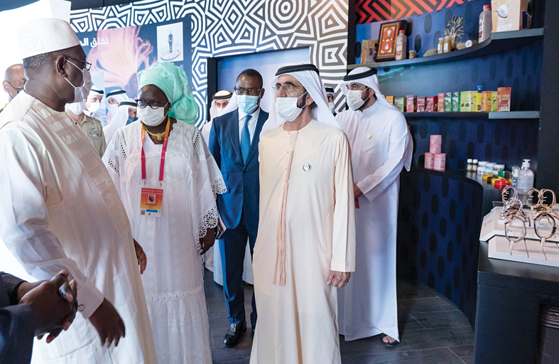 وشاهد صاحب السمو الشيخ محمد بن راشد آل مكتوم والرئيس ماكي سال المعروضات التي يضمها الجناح والتي تبرز مشروعات تسعى من خلالها السنغال إلى إحداث نقلات نوعية في مجالات حيوية عدة تشمل التنقل والسلع والخدمات والبيانات، بما في ذلك التطور الكبير في مجالات البنية التحتية ونظم النقل الجوي وشبكة السكك الحديدية، كذلك الموانئ البحرية التي تعد من أهم مجالات التعاون بين البلدين لاسيما في تطوير وتشغيل البنى التحتية الخاصة بالمرافئ البحرية في ضوء الخبرة الكبيرة التي تتمتع بها دولة الإمارات في هذا المجال.
