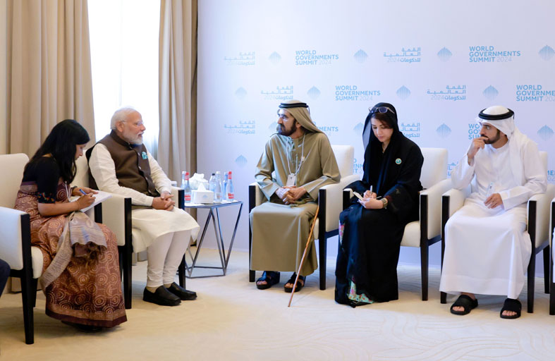 التقى صاحب السمو الشيخ محمد بن راشد آل مكتوم، نائب رئيس الدولة رئيس مجلس الوزراء حاكم دبي، رعاه الله، أمس الأربعاء، بحضور سمو الشيخ حمدان بن محمد بن راشد آل مكتوم، ولي عهد دبي رئيس المجلس التنفيذي لإمارة دبي، دولة ناريندرا مودي رئيس وزراء جمهورية الهند الصديقة الذي يزور الدولة للمشاركة كضيف شرف في القمة العالمية للحكومات 2024 التي انطلقت 12 فبراير الجاري في دبي تحت شعار "استشراف حكومات المستقبل" واختتمت أمس الأربعاء.