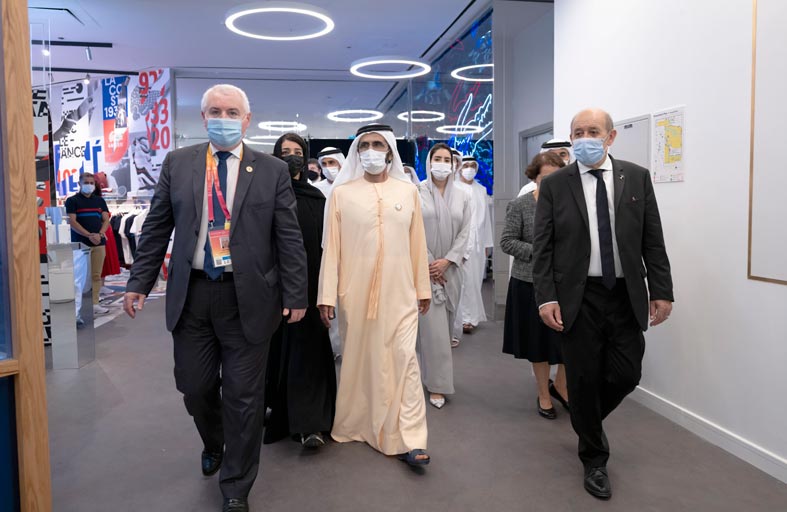 وأعرب صاحب السمو الشيخ محمد بن راشد آل مكتوم عن ترحيبه بالمشاركة الفرنسية المتميزة في الحدث العالمي الكبير على أرض الإمارات وفي رحاب مدينة دبي مع أول انعقاد له في منطقة الشرق الأوسط وأفريقيا وجنوب آسيا، بما يمهد له المعرض من فرص لتعزيز الشراكات الدولية القائمة واستحداث المزيد منها من أجل التواصل إلى حلول ناجعة للتحديات التي تواجه البشرية جمعاء والاحتفاء بالتراث الإنساني الذي يشكل القاعدة الصلبة للانطلاق نحو المستقبل، حيث تلتقي إرادات أكثر من 192 دولة حرصت على التواجد في هذا المحفل الدولي الضخم تحت شعار واحد يجمعها وهو تواصل العقول وصنع المستقبل.