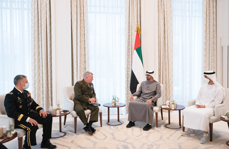 استقبل صاحب السمو الشيخ محمد بن زايد آل نهيان ولي عهد أبوظبي نائب القائد الأعلى للقوات المسلحة أمس- في قصر الشاطئ - الفريق أول كينيث ماكنزي قائد القيادة المركزية الأمريكية.