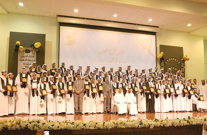 وتابع الكعبي: وها نحن الآن وفي نهاية العام الدراسي نزف للوطن بشرى تخرج الدفعة التاسعة  عشرة من طلبة مدرسة الدهماء ليكونوا رافدا جديدا  للإمارات الغالية . وفي ختام الحفل كرم الشيخ الدكتور محمد بن حم الطلاب الخريجين متمنياً لهم التوفيق في قادم التحديات .