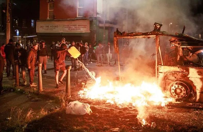 وأظهرت لقطات على وسائل التواصل الاجتماعي أشخاصاً يشعلون النيران في حافلة وسيارة شرطة، وكانت حشود من الناس تجري وهم يصرخون في كل مرة يحدث فيها انفجار، وفق ما نقلته وسائل إعلام بريطانية.