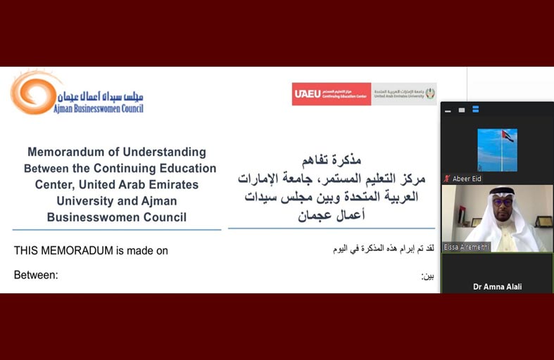 وقع المذكرة عن بُعد عبر خاصية الاتصال المرئي، سعادة الدكتورة آمنة خليفة آل علي رئيس مجلس سيدات أعمال عجمان وسعادة الدكتور عيسى عيد الرميثي مدير مركز التعليم المستمر في جامعة الإمارات.