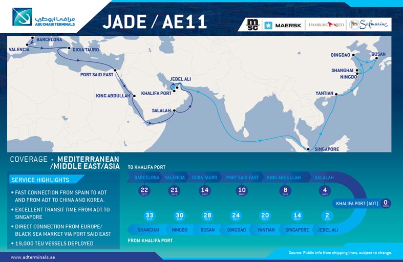 إن إضافة خدمات جديدة على غرار خدمة (جايد) إلى جانب التوسعة المستمرة لمحطة حاويات ميناء خليفة - والتي ستتيح لنا مضاعفة الطاقة الإستيعابية السنوية إلى 5 ملايين حاوية نمطية بحلول نهاية هذا العام - سيعكس التزامنا المستمر بتقديم أفضل الحلول اللوجستية الممكنة لعملائنا».  يتكون الخط الملاحي المعتمد لخدمة (جايد) من وإلى الموانئ التالية: جويا تورو، وبرشلونة، وفالنسيا، وشرق بورسعيد، وميناء الملك عبد الله، وصلالة، وميناء خليفة (مرافئ أبو ظبي)، وجبل علي، وسنغافورة، ويانتيان، وتشينغداو، وبوسان، ونينغبو، وشنغهاي، وشيامن، ونانشا.