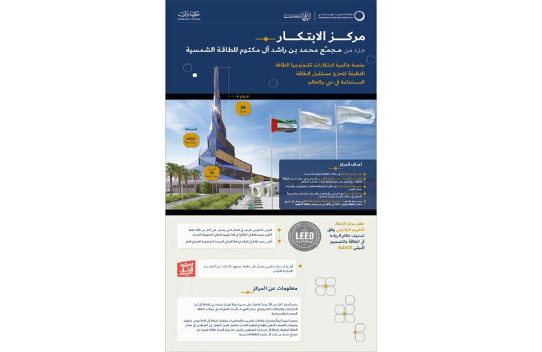 يعد مركز الابتكار، التابع لهيئة كهرباء ومياه دبي في مجمع محمد بن راشد آل مكتوم للطاقة الشمسية، منصة عالمية لابتكارات الطاقة المتجددة والنظيفة تسهم في صياغة مستقبل الطاقة المستدامة على مستوى العالم . وتهدف الهيئة من خلال المركز إلى دعم الابتكار والإبداع في مجال الطاقة النظيفة والمتجددة ورفع مستوى الوعي حول الاستدامة إضافة إلى صقل القدرات الوطنية وتعزيز تنافسية الأعمال في هذا القطاع الواعد . وتدعم أبحاث المركز في مجال الطاقة الشمسية استراتيجية دبي للطاقة النظيفة 2050 التي تهدف إلى تنويع مصادر الطاقة وتوفير 75% من القدرة الإنتاجية للطاقة في دبي من مصادر الطاقة النظيفة بحلول عام 2050. ويعتبر مركز الابتكار أول وأكبر مركز حكومي يحصل على علامة “ بمجهود الشباب “ من المؤسسة الاتحادية للشباب حيث عمل عليه فريق من الكوادر الإماراتية الشابة.