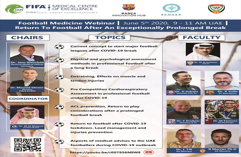 يُنظم مركز “الفيفا الطبي المتميز” بدبي واتحاد الإمارات لكرة القدم يوم “الجمعة” المقبل أكبر مؤتمر طبي رياضي عالمي بنظام الاتصال المرئي “عن بُعد” بمشاركة أكثر من 2000 متخصص في العمل بالأطقم الطبية بمختلف الاتحادات الوطنية والأندية العالمية وذلك تحت عنوان “عودة إلى كرة القدم بعد أطول توقف استثنائي».